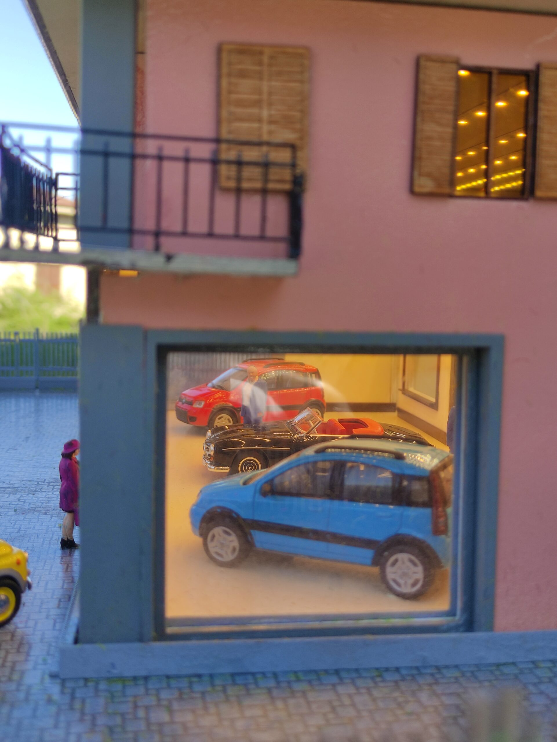 Riproduzione di un Autosalone esistente completo di portone elettrificato,ย  5 modelli di auto in scala 1/43 e illuminazione interna.